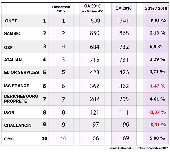 Ce « Top 10 » des entreprises de propreté confirme le poids des 4 groupes leaders, avec une pôle position toujours très affirmée du groupe Onet (1,741 milliards d'euros) soit le double de celui son successeur immédiat, Samsic. D'une façon générale la hiérarchie observée ces dernières années est conservée, les 4 premières entreprises de propreté et de services associés (Onet, Samsic, GSF, Atalian se démarquant de leurs concurrents immédiats. Au-delà de la très forte progression d'activité du leader Onet, il convient de noter les performances du groupe GSF dont le chiffre d'affaires a progressé de près de 13% entre 2015 et 2016 grâce à la seule croissance interne.