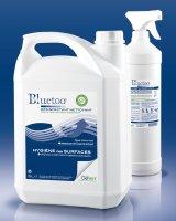 Produit non soumis à un étiquetage de sécurité. - Mélange de sel nettoyant naturel et de tensio-actifs non ioniques, agent désinfectant. - Usage externe uniquement, pour tous supports nécessitant une désinfection de contact : sanitaires, parties communes, sols et murs, mobilier de bureaux et chambres, instruments et ustensiles professionnels, accessoires de transports, lieux publics : guichets, poignets, mains courantes… - Éviter tout contact du produit avec l’air, bien refermer le récipient après usage ou transvasement. - En solution prête-à-l’emploi : bidon de 5L par carton de 4 avec 1 pulvérisateur et 1 robinet fournis. - Bluetoo peut se diluer par vos soins jusqu’à 1% tout en conservant ses qualités désinfectantes intégrales sur Staphylococcus auréus, Pseudomonas aeruginosa, Escherichia coli (pas de coloration & décoloration dans ce cas). - Bluetoo s’utilise plus spécifiquement avec un pulvérisateur comprenant un embout muni de 2 systèmes de pulvérisation, mais peut s’utiliser avec des pulvérisateurs grands modèles pour des applications d’envergure.