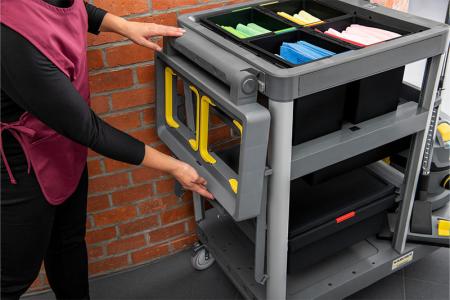 Le rendement peut ainsi être amélioré d’environ 15%. Il est également évolutif grâce à l’ajout a posteriori d’équipements additionnels tels que des bacs, des supports pour sacs poubelle, des systèmes de fixation pour balai mop ou des portes latérales. L’opérateur peut également connecter plusieurs chariots entre eux pour faciliter leurs déplacements.