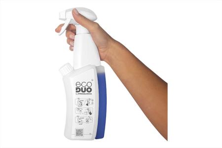 Attentif à proposer des solutions d’hygiène innovantes, le fabricant espagnol Proquimia a conçu le système EcoDuo. Lequel associe une tête et un pulvérisateur (spray ou mousse) d’une part, de l’autre le flacon d’eau pour la dissolution et enfin le flacon de produit concentré. Sur les cinq produits de la gamme (entretien général et cuisine) trois sont porteurs de l’Ecolabel européen. Aucun contact avec le produit chimique et aucun risque de surdosage : le dispositif préserve l’utilisateur. Il préserve aussi l’environnement en utilisant des matériaux plastiques recyclés et recyclables. La tête réutilisable est conçue pour plus de 50 000 pulvérisations. Seul déchet généré, le réservoir de produit concentré est en plastique mono-matériau, facilitant ainsi son recyclage total.