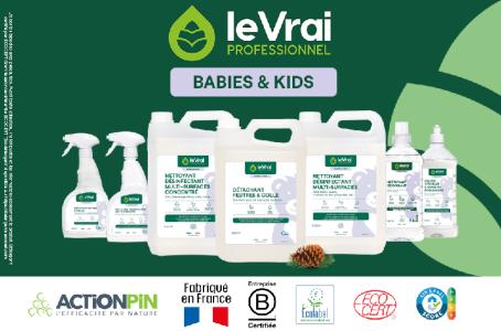 Forte de son savoir-faire unique de formulation en chimie verte, la marque Le Vrai Professionnel a su associer les vertus des dérivés de Pin aux différentes biotechnologies pour développer une nouvelle gamme « Babies & Kids » performante et spécifiquement conçue pour les milieux sensibles de la petite enfance et du scolaire. Afin d’aider au quotidien les structures d’accueil de jeune public à adopter des pratiques plus responsables, la marque propose une gamme complète de détergents, désinfectants, détachants et odorisants labellisées Ecolabel, Air Label ou Ecocert. Ces produits, formulés avec des ingrédients bio-sourcés sont conçus pour être efficaces tout en minimisant les risques pour les utilisateurs et les usagers. Avec leur haute teneur en ingrédients d’origine végétale et minérale, ils minimisent les risques d’allergies et garantissent de très faibles émissions du produit dans l’air pour une bonne qualité de l’air intérieur.